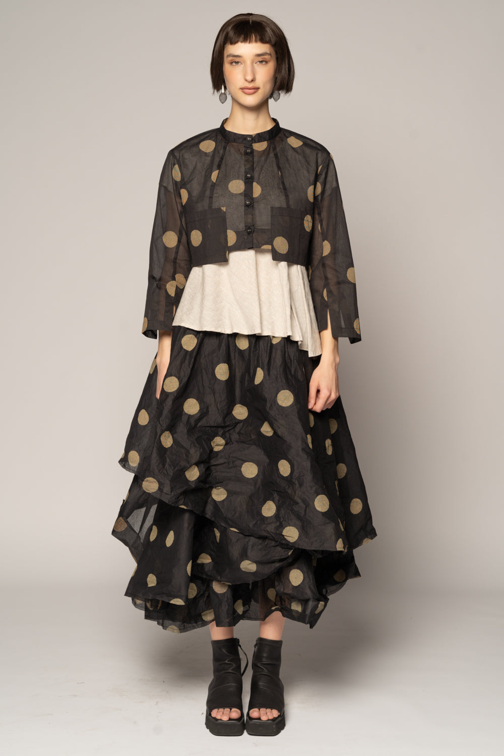 The Dotto Short Jacket feels airy and poetic—an easy layer that seems to float. Cut from whisper-light cotton organdy with a softly dappled dot motif, its cropped proportion brings gentle balance to dresses and wide pants alike. A neat mandarin collar and delicate buttons frame the face, while a subtle back split moves with grace. Front “hanging” pockets lend an artisan touch. Wear it buttoned as a delicate blouse or open as a jacket over the Sabi Top or Dotto Layer Skirt.