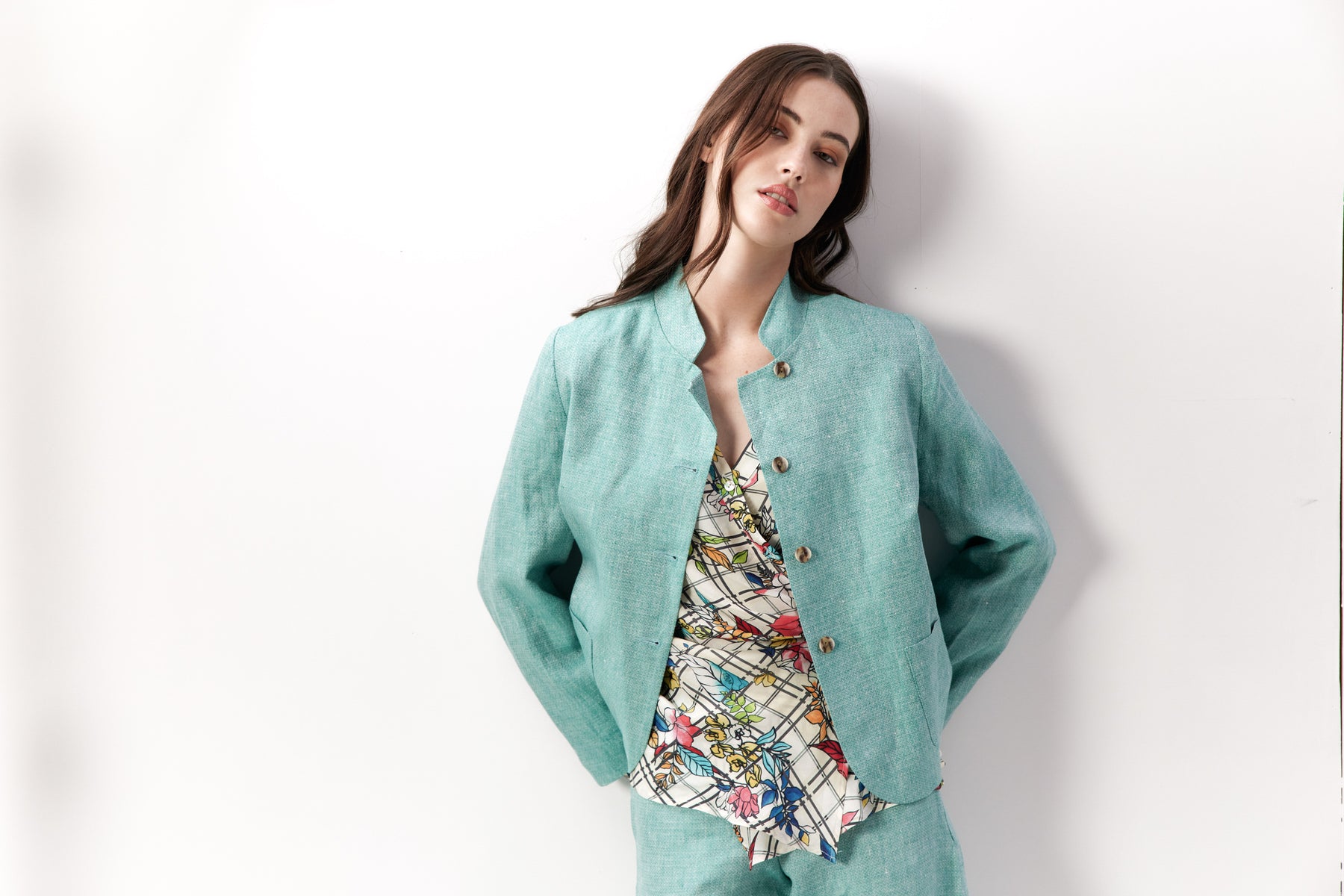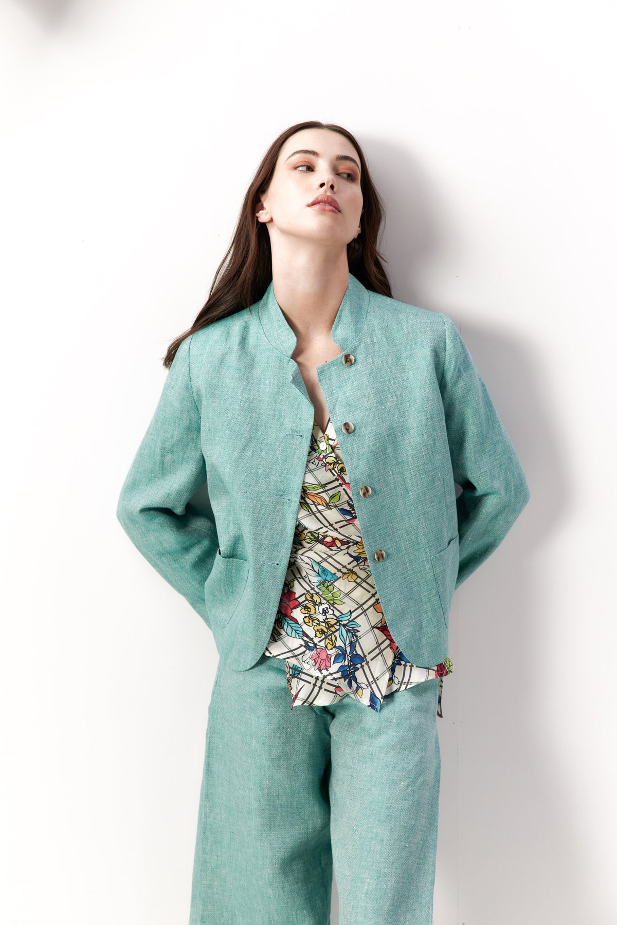 Boxy cut jacket in a soft linen that can be tapered in with a tie at the back. Detailed with two front pockets, button up and Mock collar.
