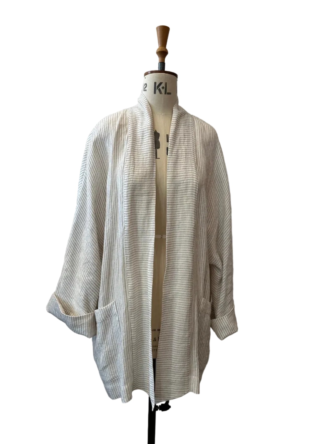 Longline jacket in textured, midweight linen-blend fabric with an open front design, patch pockets, large sleeve cuffs, and contrast fabric back running down length of back.