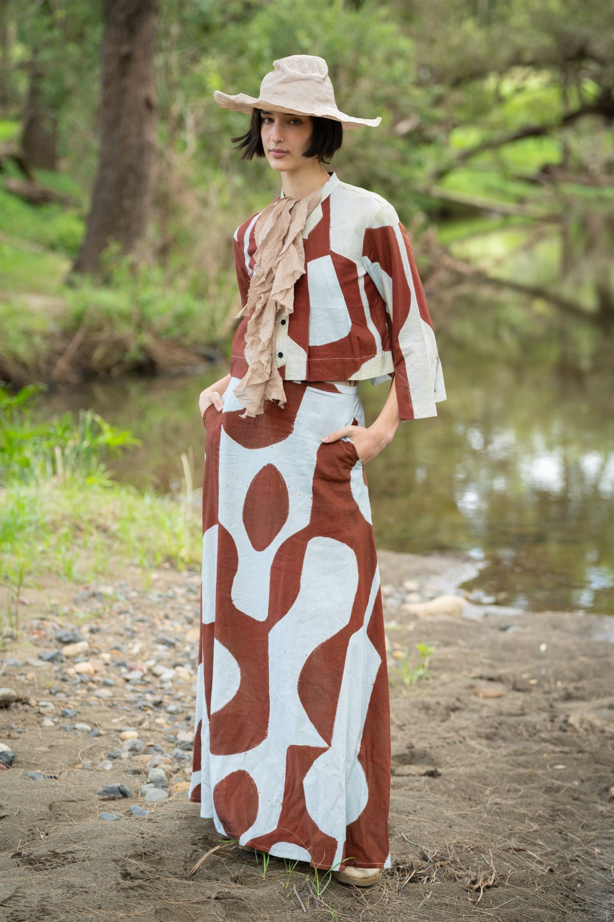 An art piece you can wear. The Kakure Short Jacket is cut in a comfortable linen–viscose blend and printed with Sally’s softly drawn “vessels”—organic forms that honour the quiet beauty of holding and sharing. Fresh and light for spring, Kakure brings gentle structure to soft layers. Wear it buttoned as a neat top or open as an easy jacket—the cropped proportion sits beautifully over dresses and high-waist pants.