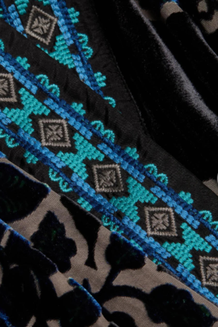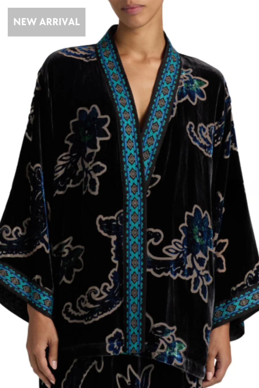 Fully reversible, with two unique looks to choose from, this elegant kimono features an open front with an embroidered trim and is finished with slip pockets at the sides.