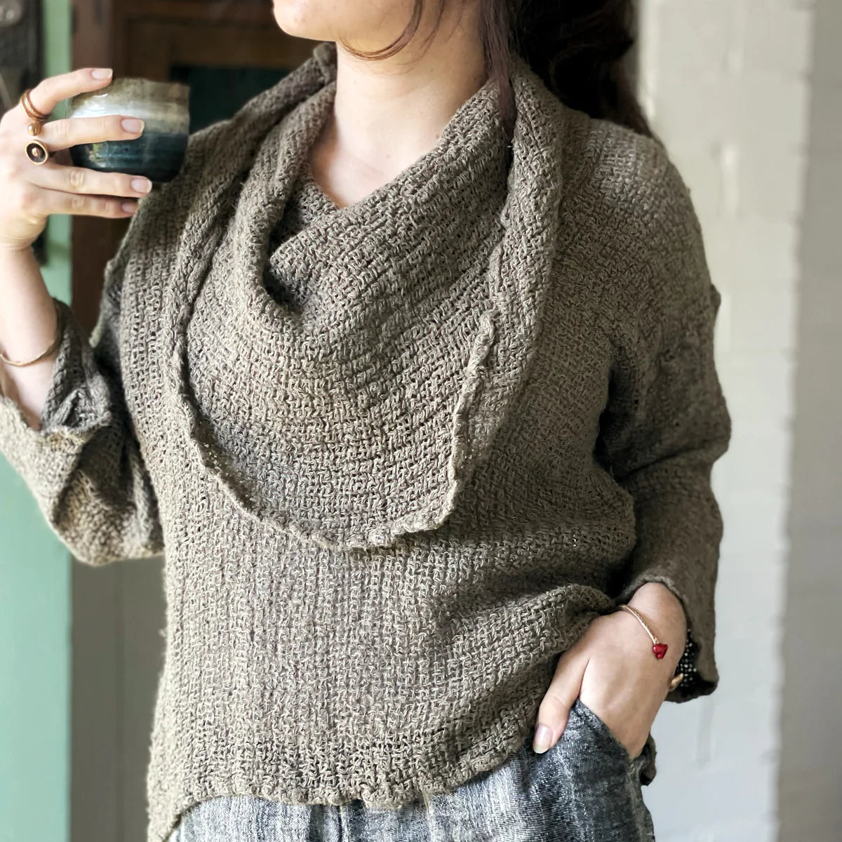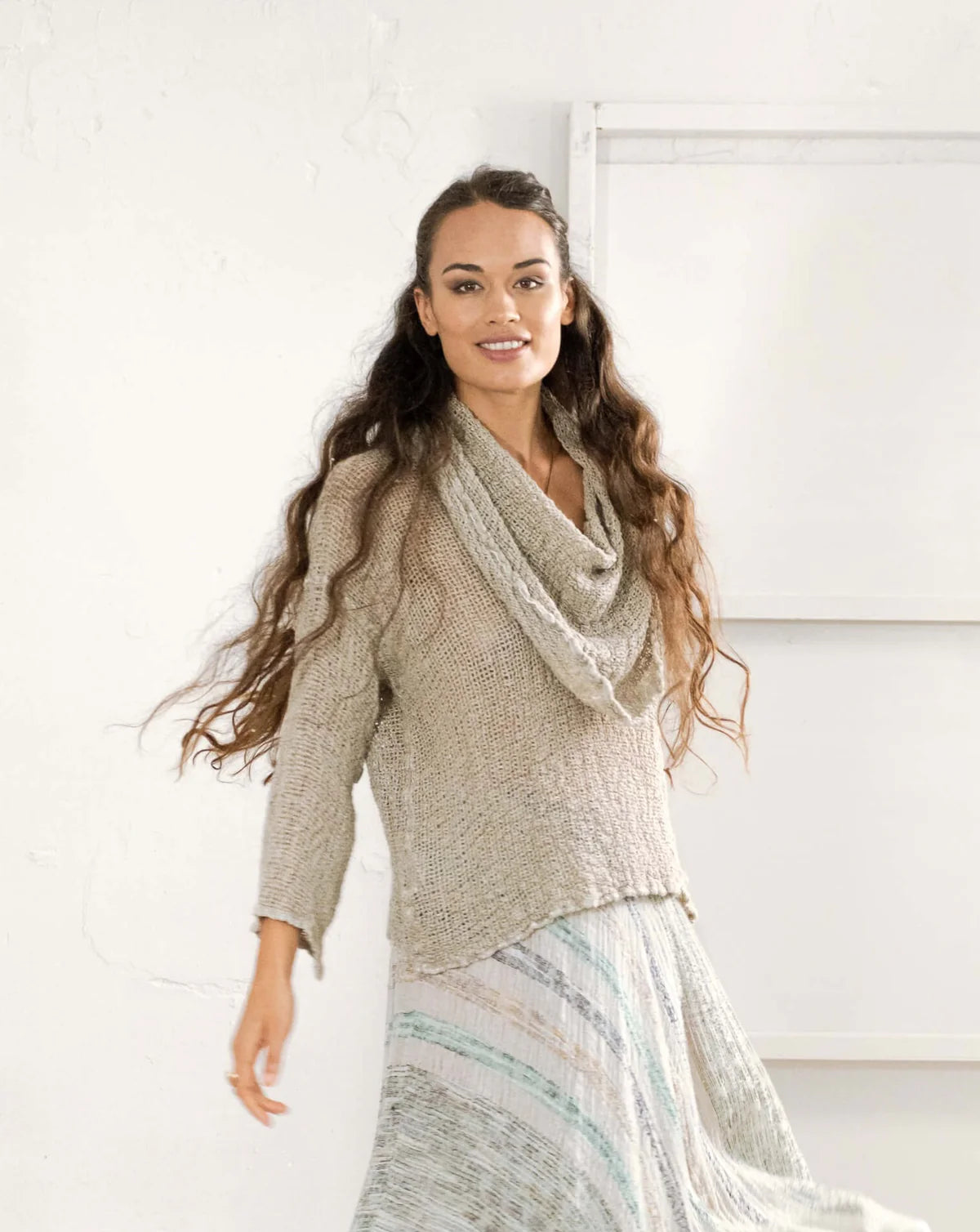 Open weave linen top with 3/4 sleeves and cowl neck. The Delusa top is longer at the back hem than front. Made in Italy.