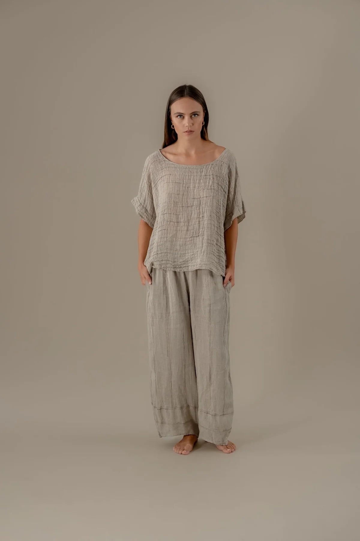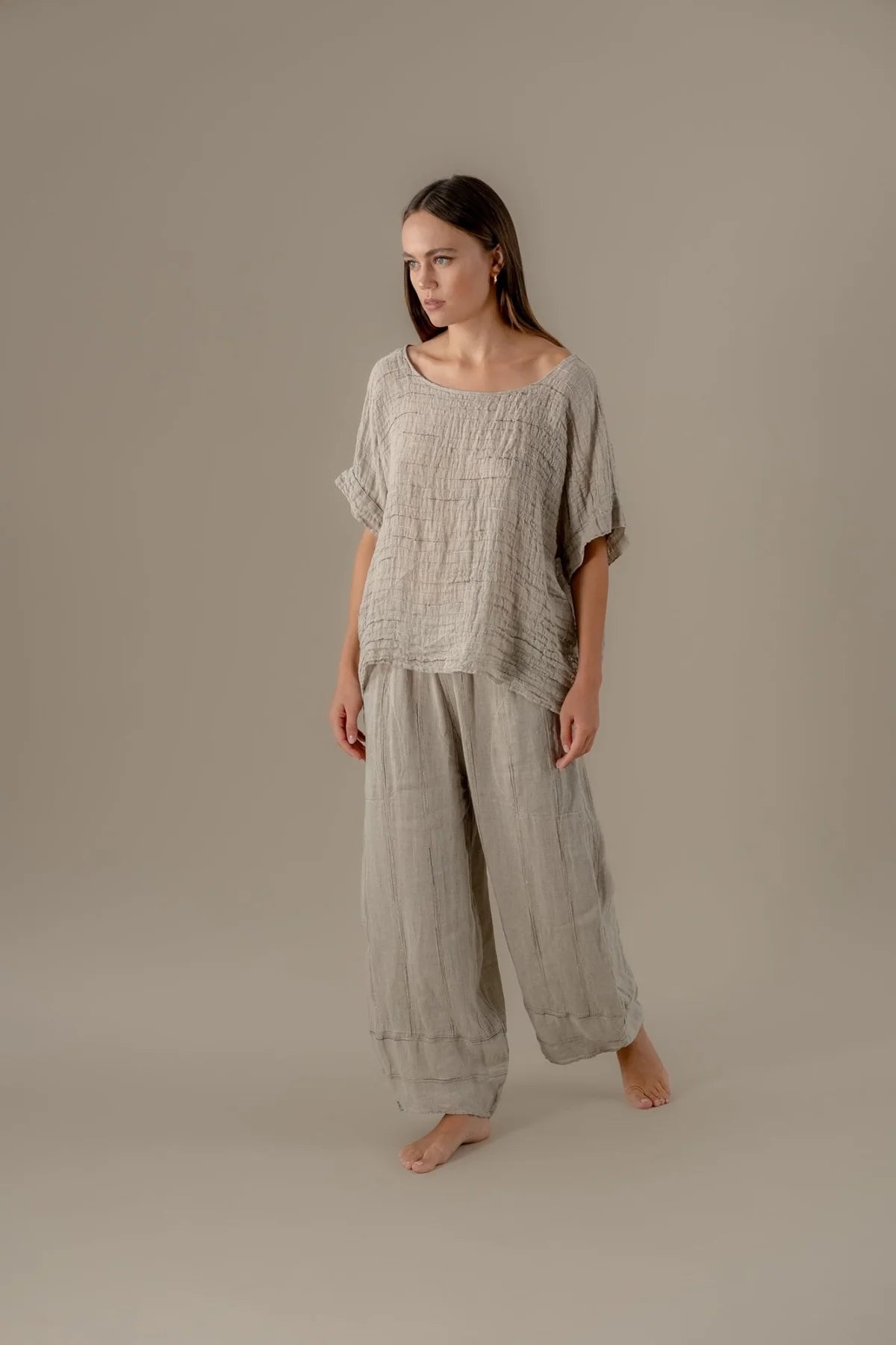 The Camicia Minosse Riga Egitto combines an effortless silhouette with refined texture. Crafted from La Bottega di Brunella’s signature linen, it features subtle, understated stripe filaments that catch the light softly, adding quiet depth to its natural weave. The relaxed, boxy fit and one-size design make it an easy, flattering choice for everyday wear.