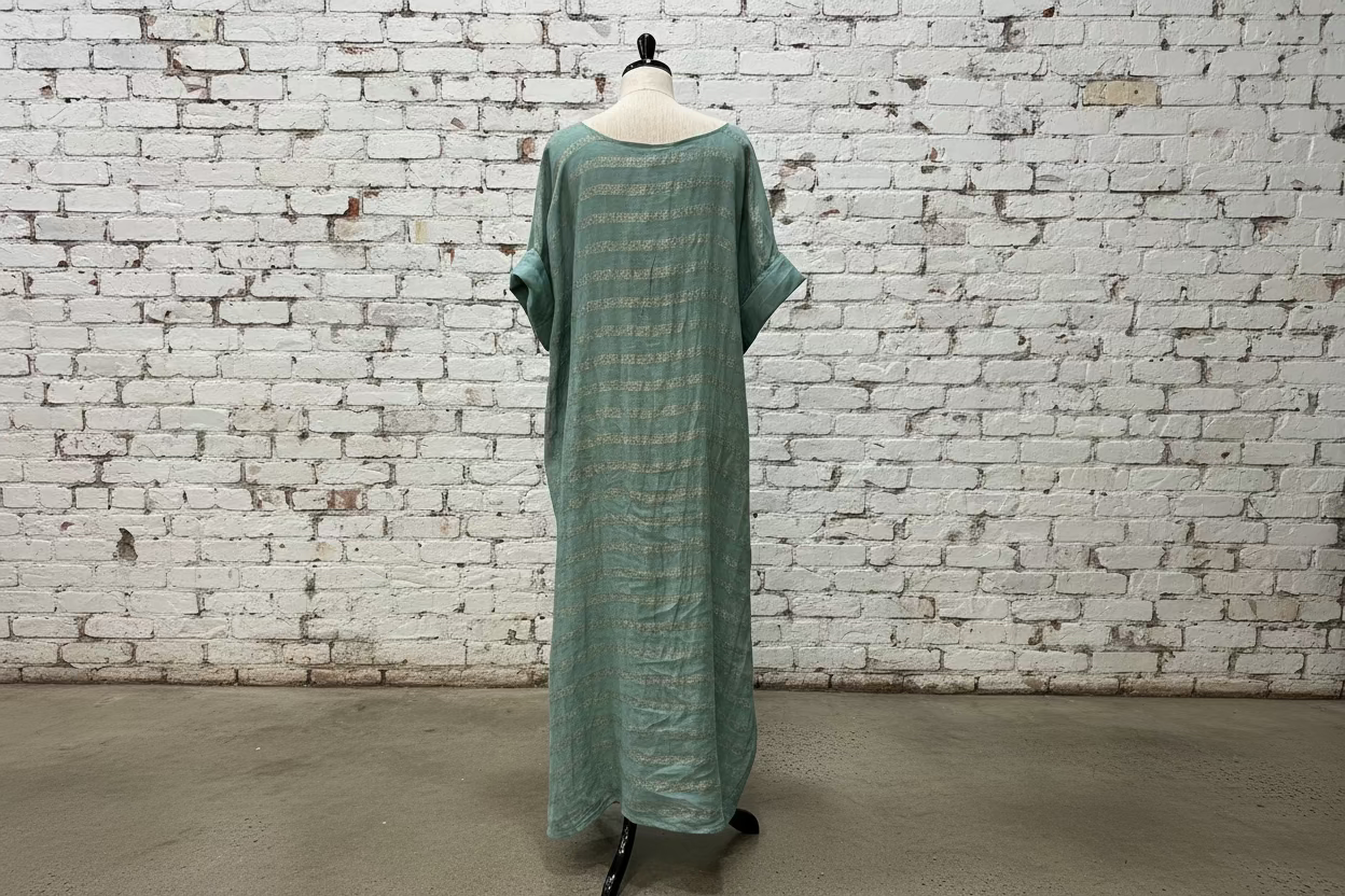The Vestito Wow Riga Luxor is a straight-cut dress crafted in La Bottega's signature linen with subtle sleeve detailing. Its fabric features delicate stripes woven with a softly shimmery filament, adding a touch of refinement and understated elegance. Designed for effortless wear, this dress drapes naturally for a relaxed yet sophisticated silhouette.
