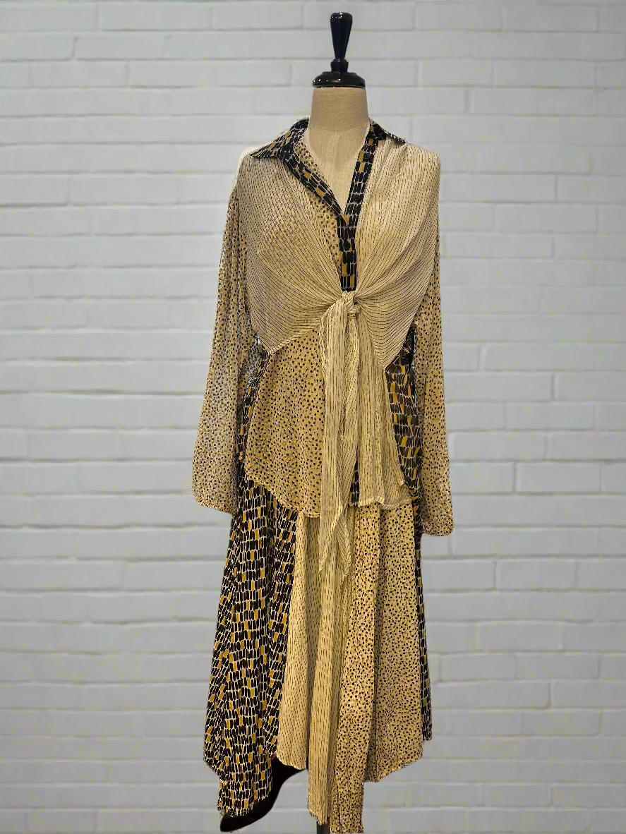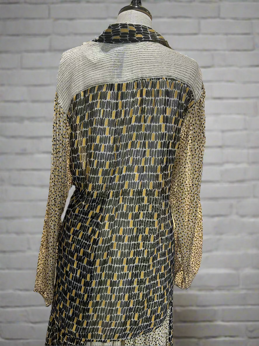 Fine, semi-sheet shirt of chiffon viscose with contrasting prints, button-doen front and waist tie details.
