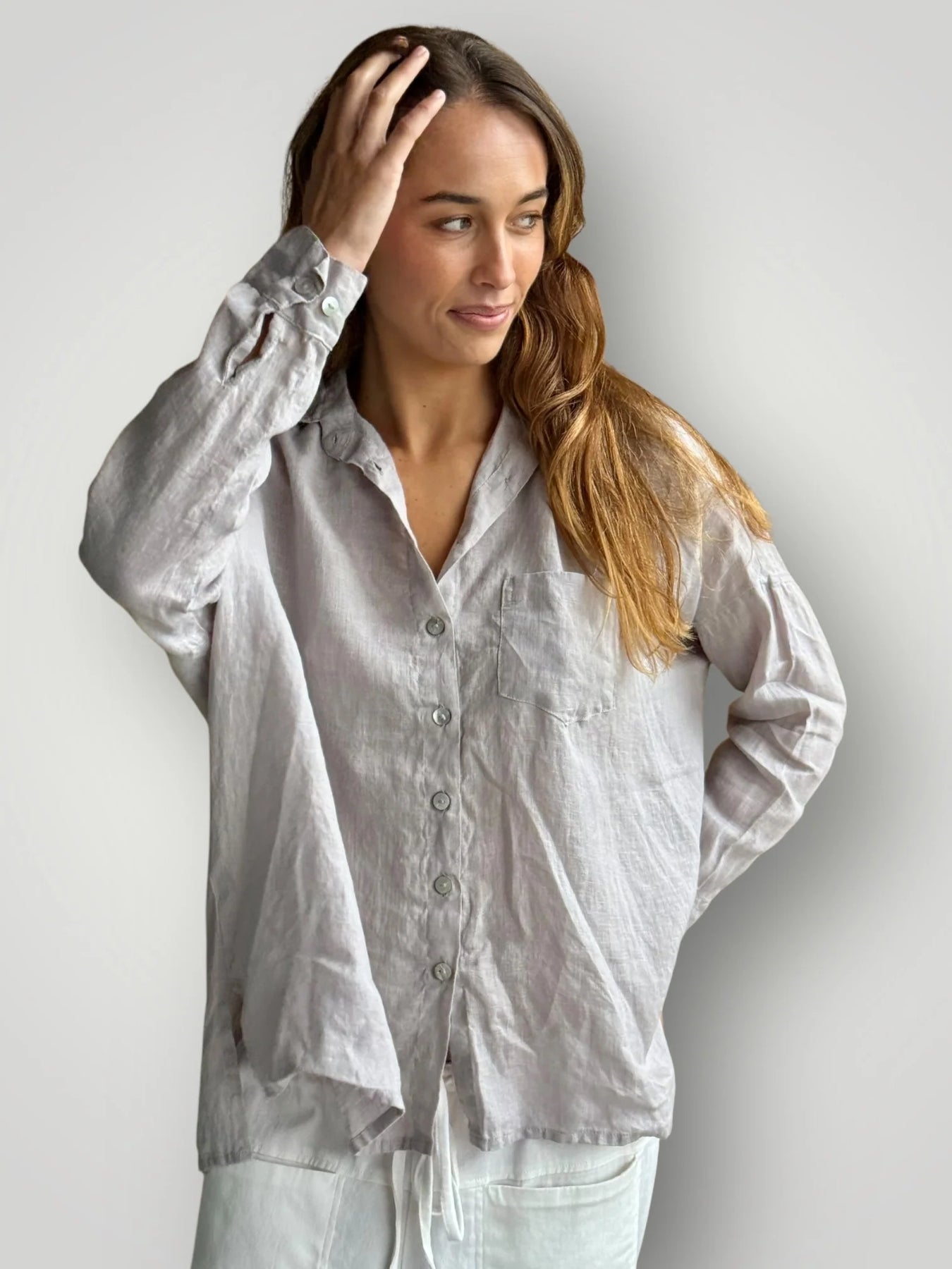 Rosie Shirt-one of our favourites now in a lovely soft pewter/stone colour, button through with small front pocket, and sleeves for rolling. A relaxed fitting style through the body -falling lower at the back. You should be able to take your usual size for a relaxed, but not oversized fit, please check the bust measurements.