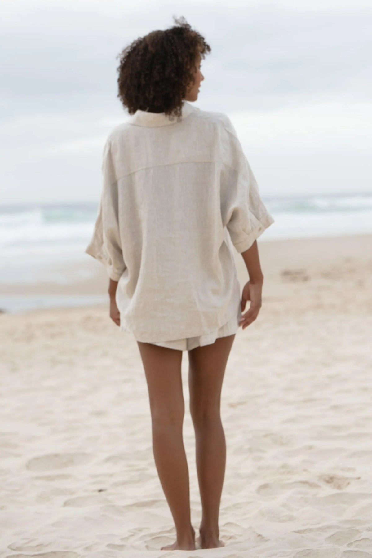 Experience style and sustainability in our oversized, mid-sleeved, PIXIE linen shirt. Made with 100% EUROPEAN FLAX and eco-friendly Corozo nut buttons.